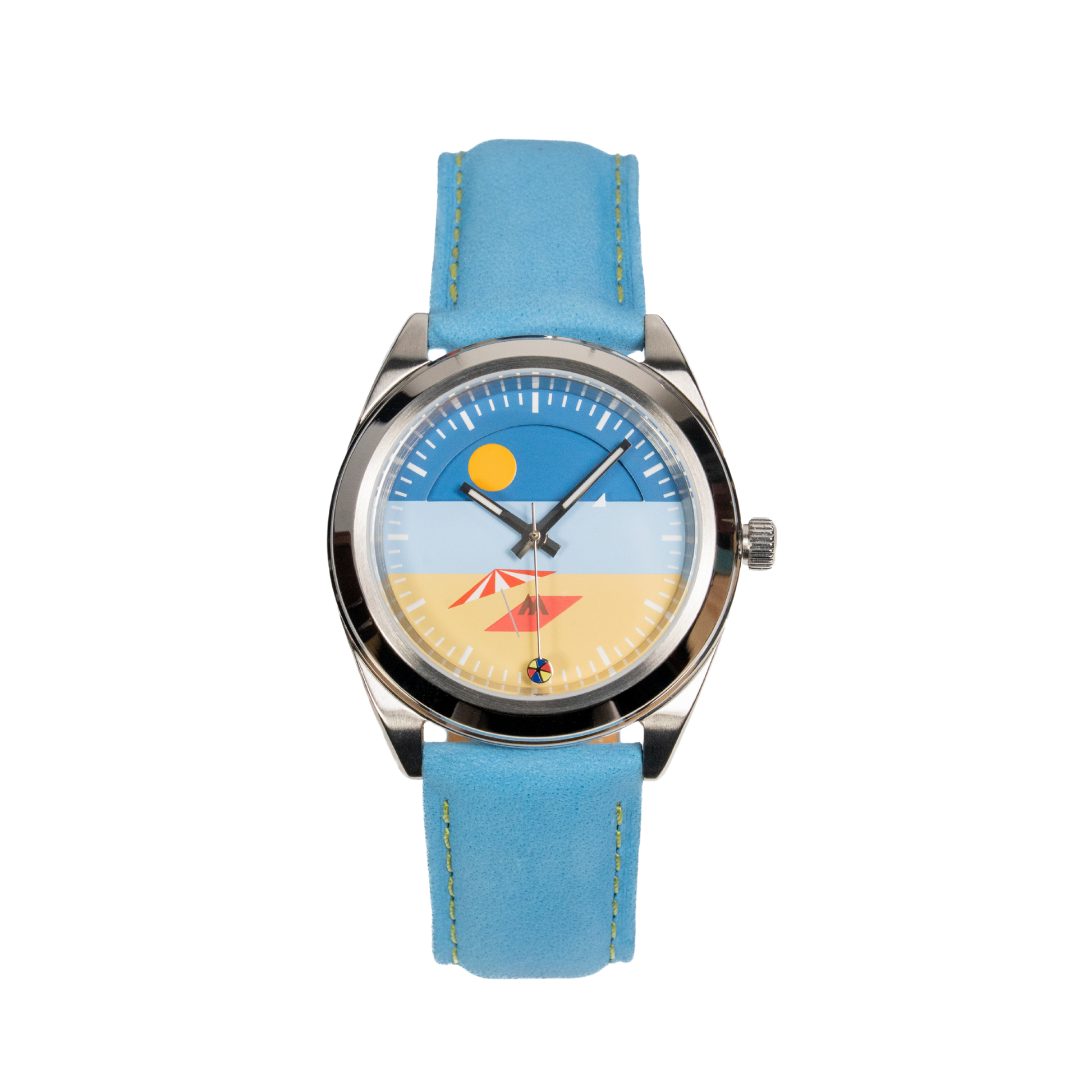 Inspired by sunny shores and cloudless skies, its vibrant dial captures the carefree spirit of summer holidays, with a golden sun above deep blue seas and a towel resting on warm sand.