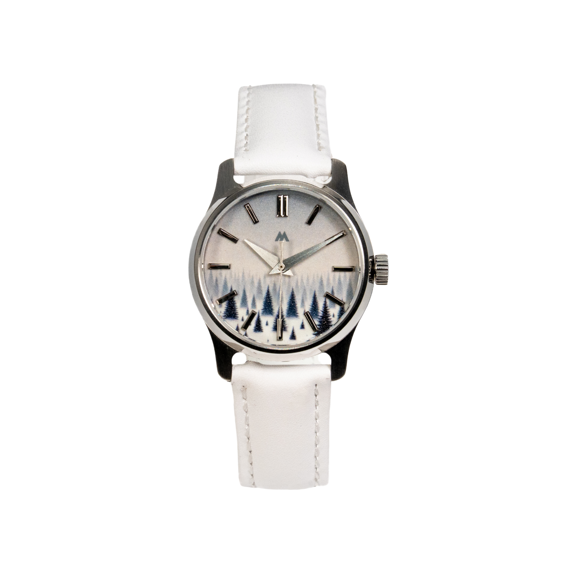 Introducing the Beyond watch, a 34mm timepiece designed for those who appreciate elegance and mystery in perfect harmony. The dial of this captivating piece transports you to a snow-covered forest, shrouded in mist and secrets. It features sleek metallic hour markers that create a striking contrast against the enigmatic backdrop.