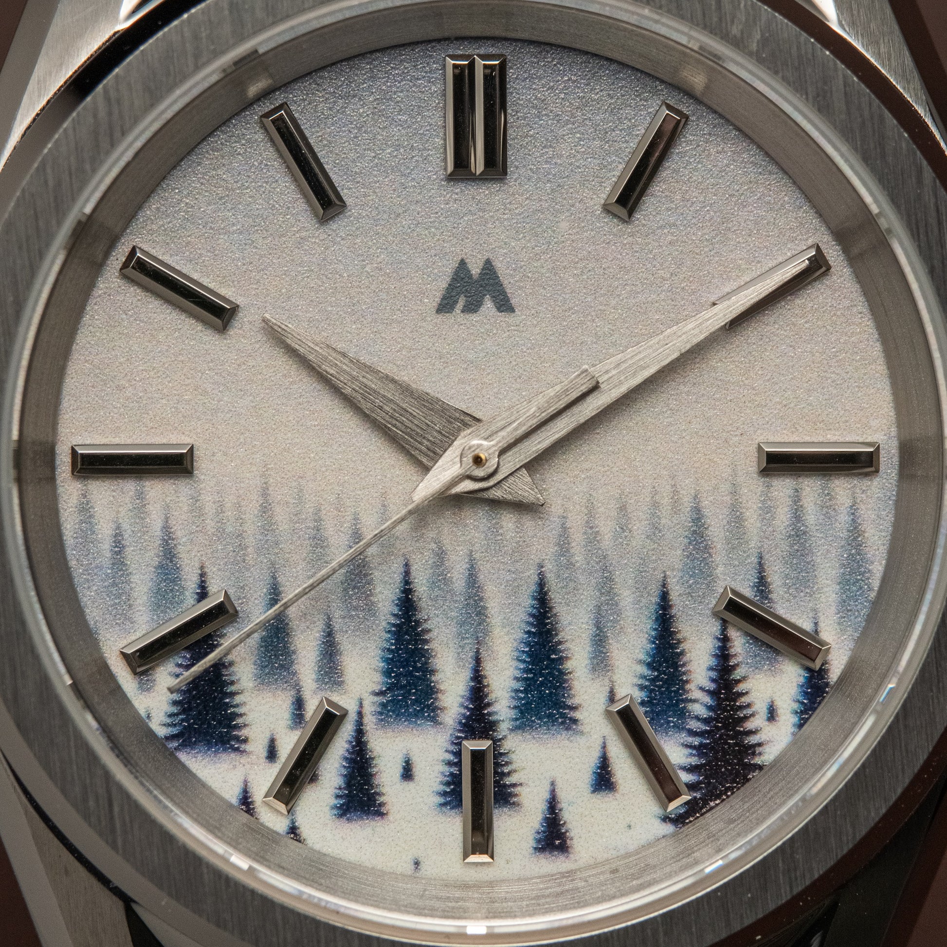 Step into the unknown with the Beyond watch, a 38mm timepiece that blends elegance with a sense of mystery. The dial transports you to a snow-covered forest, shrouded in mist and secrets. It features sleek metallic hour markers that beautifully contrast against the enigmatic backdrop, creating a captivating aesthetic.